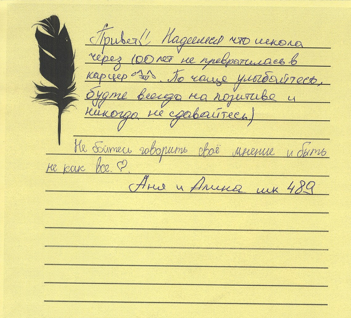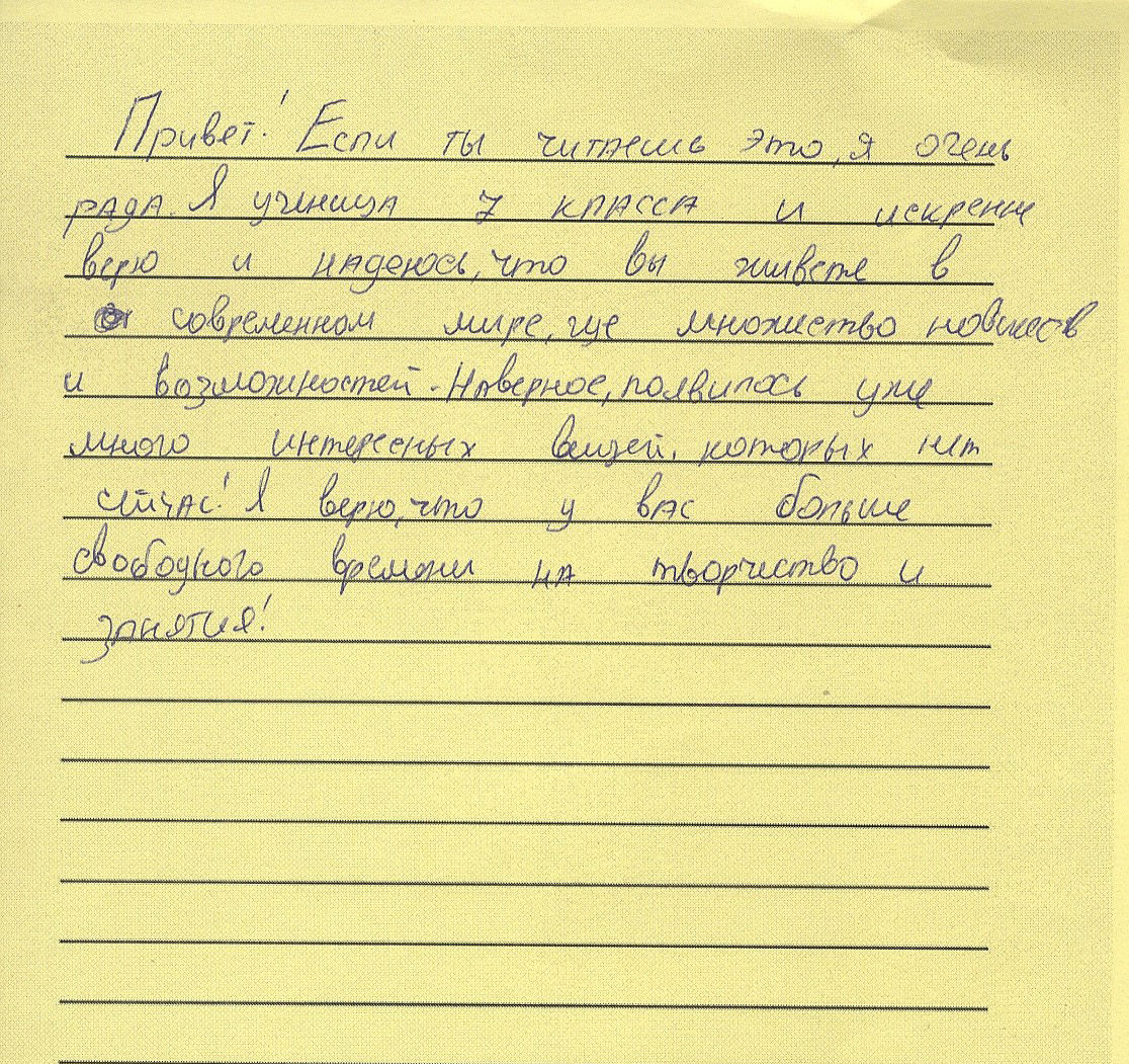 | Современное общество? Подростки задумываются и о таких серьезных вещах, как государство, социальное общество, история своей Родины и не только. Ребята просят потомков построить мир без войн и верят, что у них это обязательно получится. |